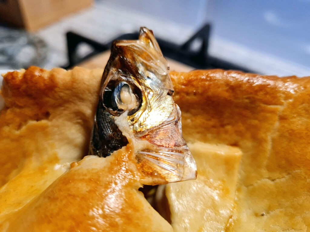 The fish were subsequently baked in a huge pie, which became known as Stargazy Pie.